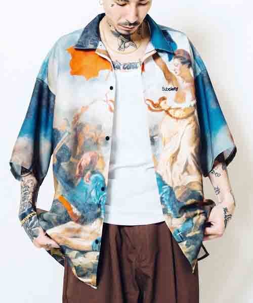 - ●美品 SUBCIETY サブサエティ オープンカラーシャツ ドラクロワ 民衆を導く自由の女神 転写プリント サイズXL