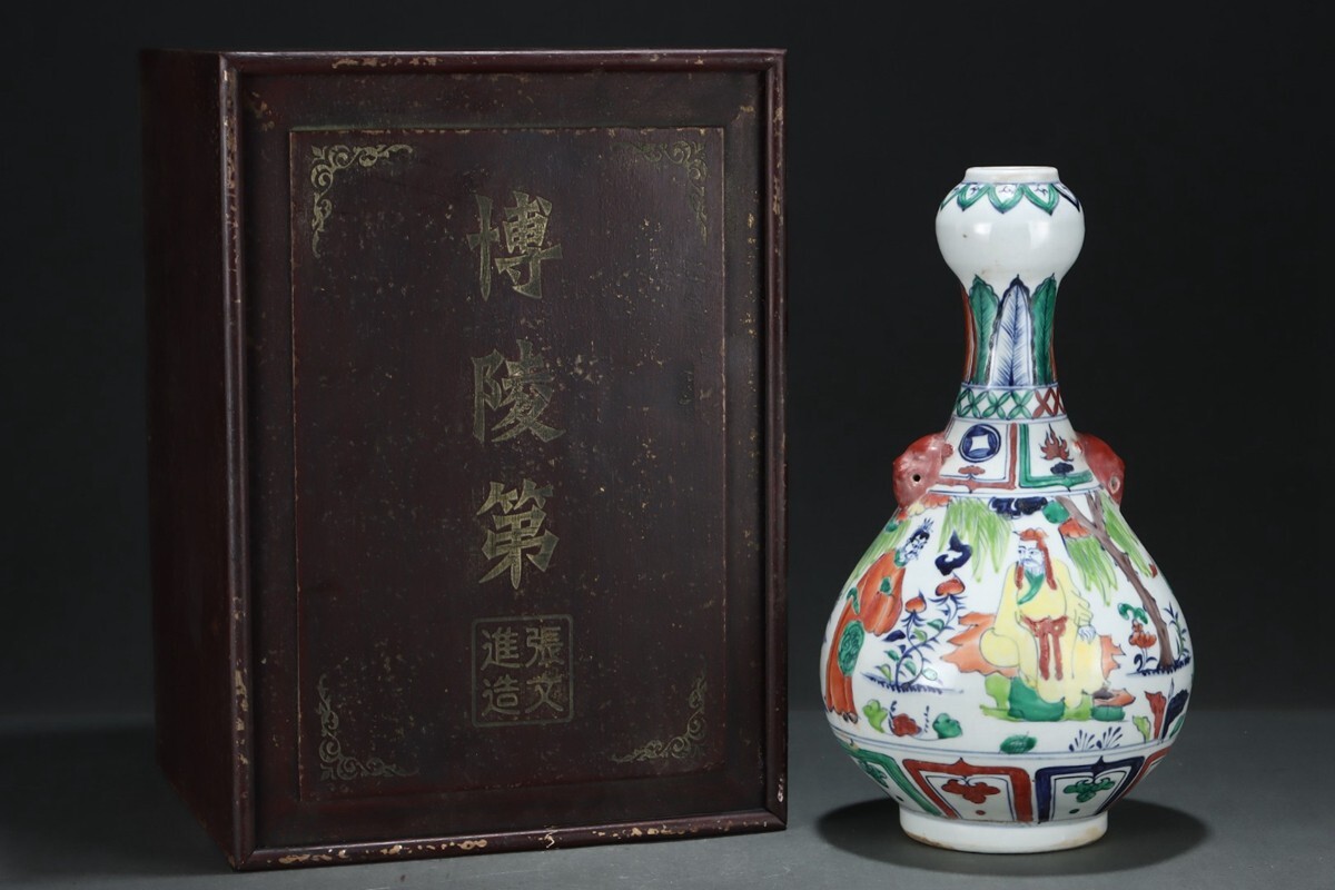 - 「元 至正年製 陶磁器 五彩人物故事双耳蒜頭瓶」染付 置物 擺件 古賞物 中国古美術 旧蔵出