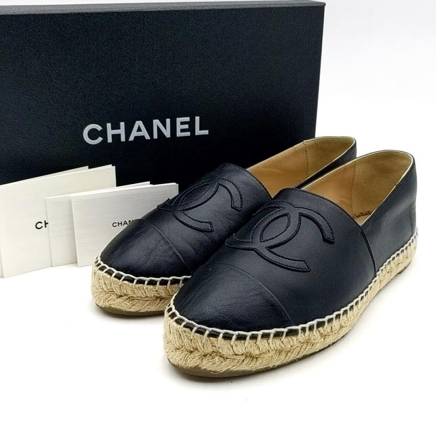 - 送料無料 美品 シャネル CHANEL エスパドリーユ スリッポン 靴 シューズ ココマーク レザー 本革 36 黒 レディース