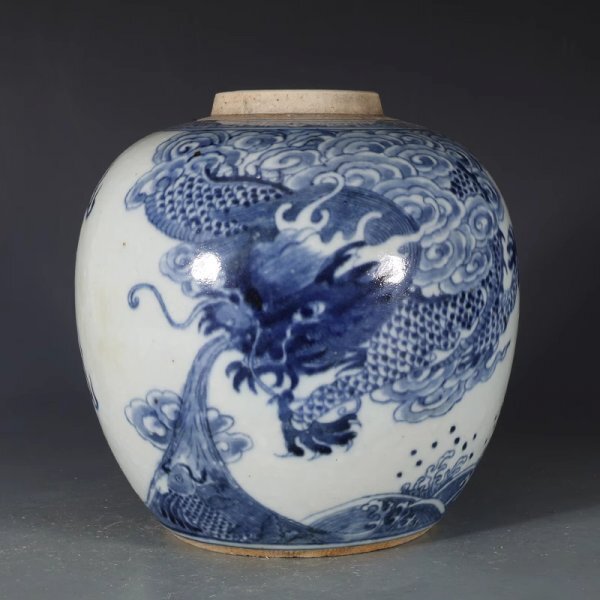 - 清時代 青花 海水龍文罐 唐物 箱付き 陶磁器 中国美術 古美術 置物 高さ18cm 口径6.5cm 胴径18cm 底径11cm RB85