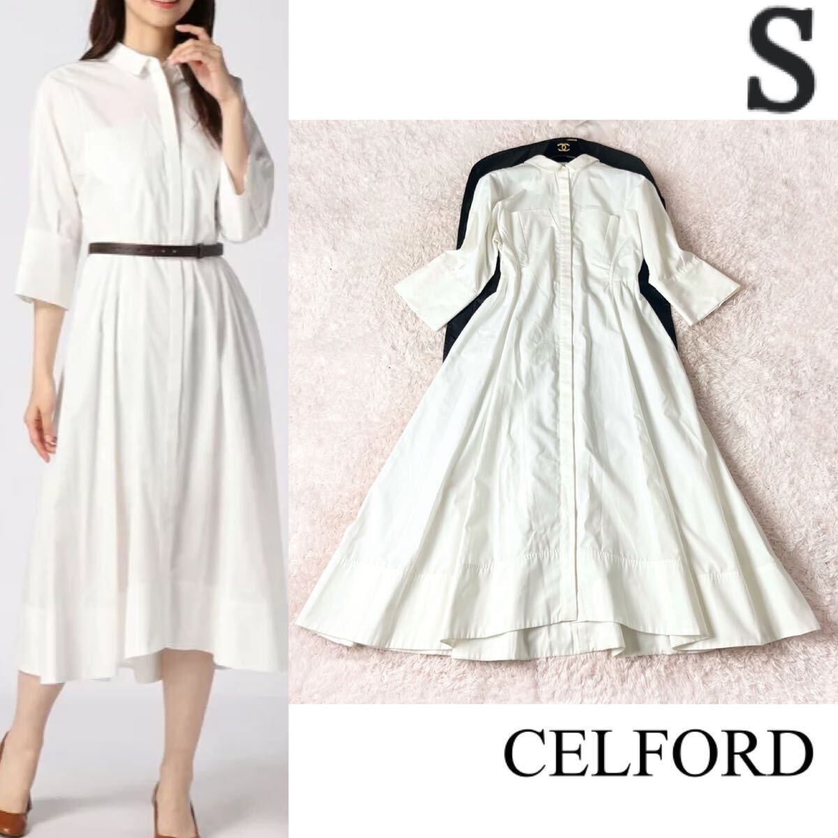 > CELFORD セルフォード タック シャツワンピース ロングワンピース 襟付き ポケット 長袖 シェルボタン フレア Aライン 白 ホワイト S 36