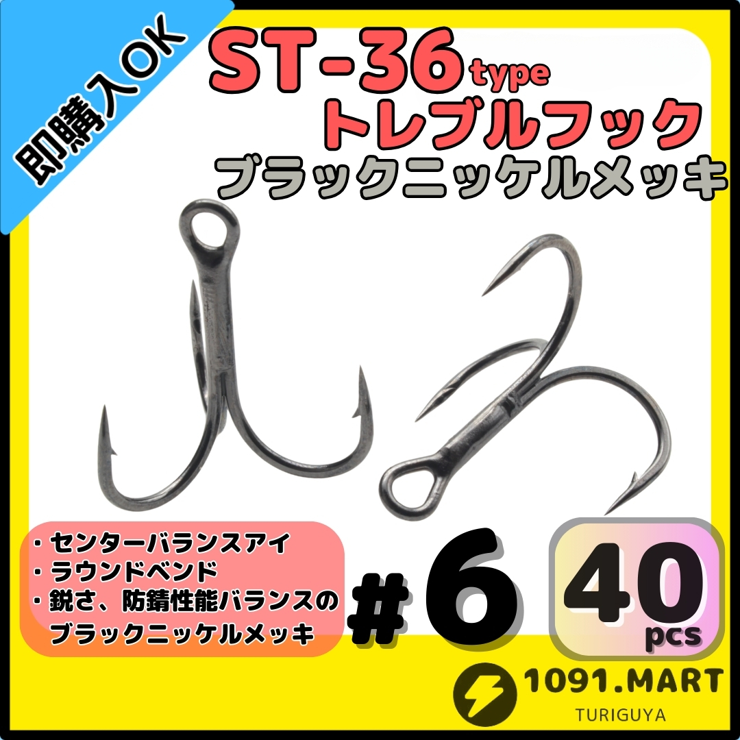 - 【送料無料】ST-36タイプ防錆トレブルフック ブラック#6 40本セット 高品質ルアーフックラウンドベンド ソルト対応トリプルフック 釣り針