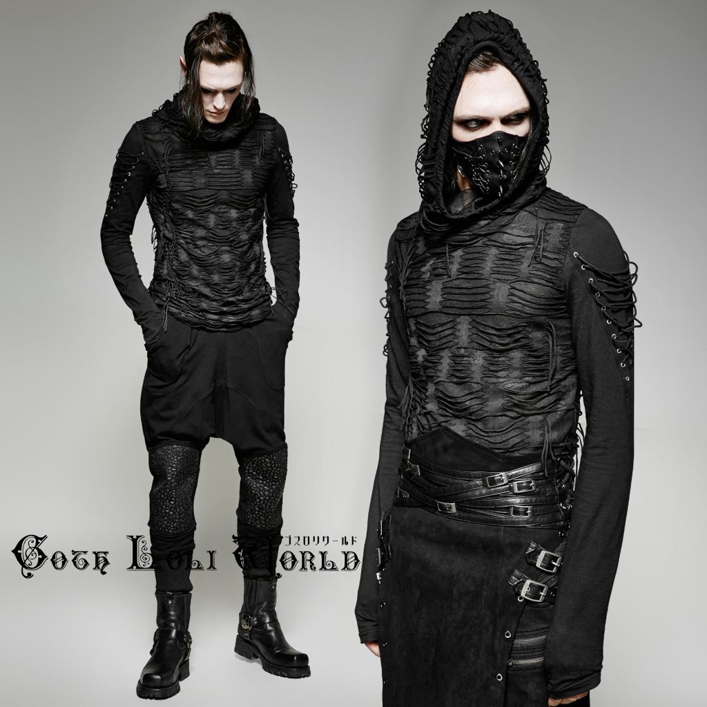 - 即納 T-438M-BK-S-M 編上げダメージフード長袖 カットソー メンズ ファッション ゴシック ゴスロリ パンク ロック ヴィジュアル系 V系