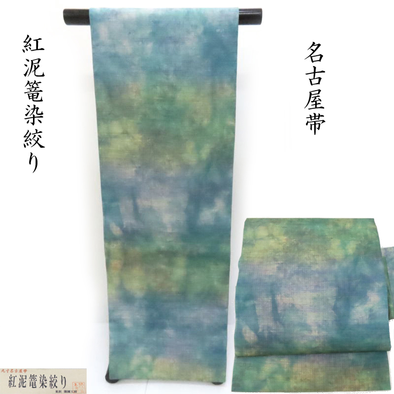 - Club藤★名古屋帯 米沢 「無料御仕立サービス品」 筬園工房 紅泥篭染絞り 九寸名古屋帯 カジュアル帯 「緑」(3415)