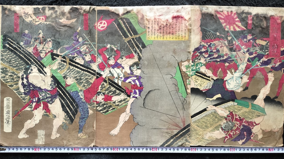 > 明治期/真作 楊洲周延「西陸暴動記」本物浮世絵木版画 武者絵 戦争絵 西南戦争 西郷隆盛 錦絵 大判 三枚続き 裏打ち