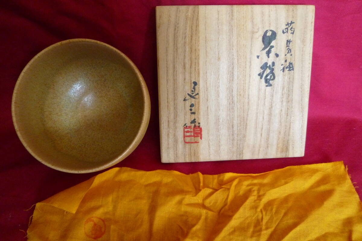 - 真作保証 京焼 谷口良三造 萌釉茶碗(共箱)共布 師:六代 清水六兵衛
