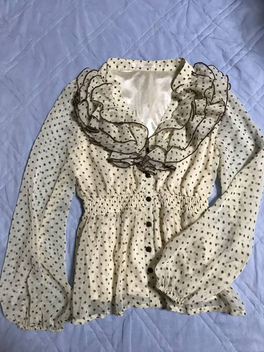 - WHOS NEXT クリーム色に茶色のドット柄前襟フリルハイウエストシャーリグデザインの長袖トップス t230
