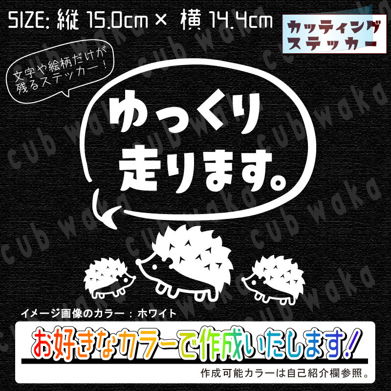 - ゆっくり走ります①ハリネズミステッカー 文字絵柄だけ残るカッティングステッカー・交通安全・安全祈願・車・バイク・カブ・リアガラス