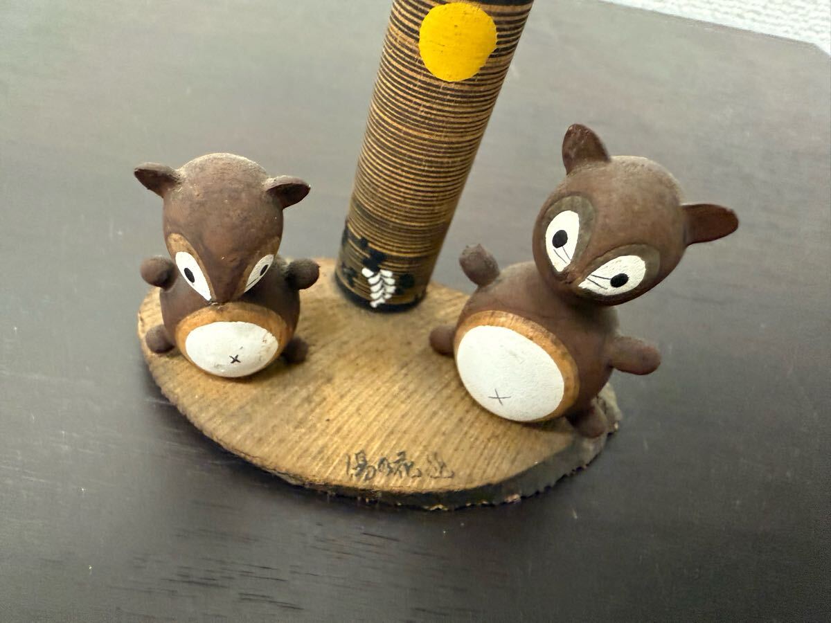 - たぬき タヌキ 親子 木製 置物 縁起物 商売繁盛 昭和期 湯の花温泉