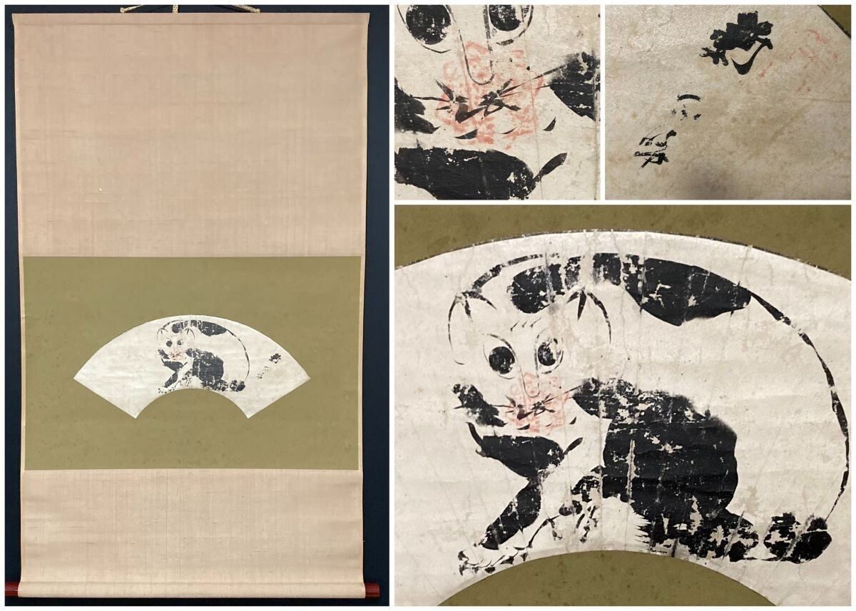 - 真作 江戸期 新田の猫 絵軸肉筆 殿様の猫 絵養蚕信仰護符 新田俊純 新田道純 掛軸 めくり 扇子 66.5cm×111cm