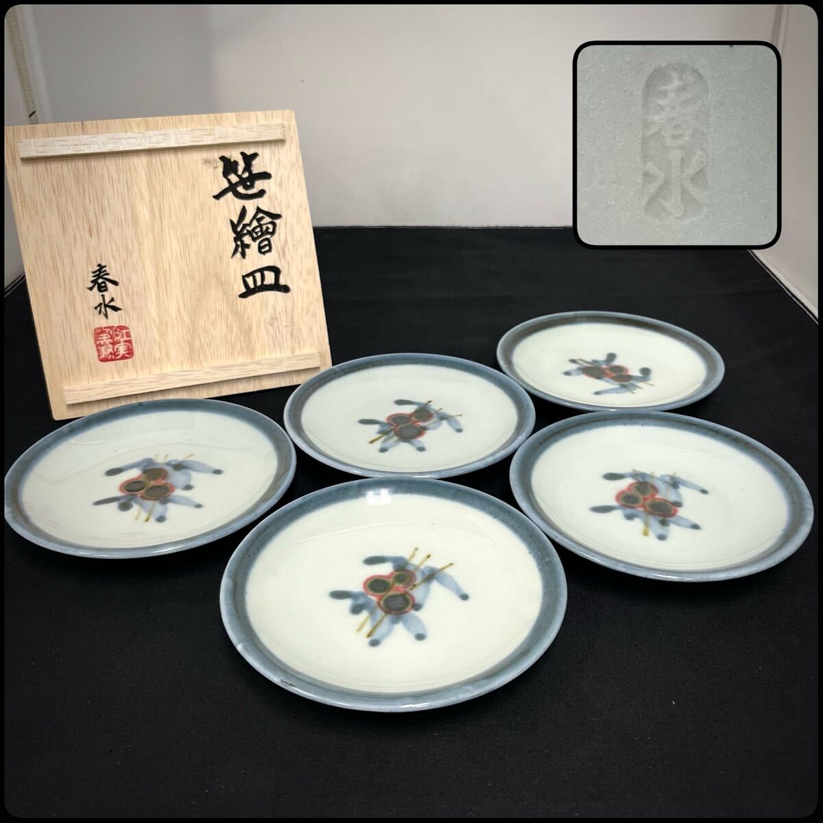 > 未使用 紅実窯 椋木春水 (椋木英三) 笹繪皿 5客揃 共箱 銘々皿 小皿 和食器 割烹 京焼 紅蓼窯 人気作家 美品 (05117Y