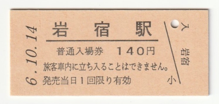 - 平成6年10月14日 両毛線 岩宿駅 140円硬券普通入場券(日付印刷)