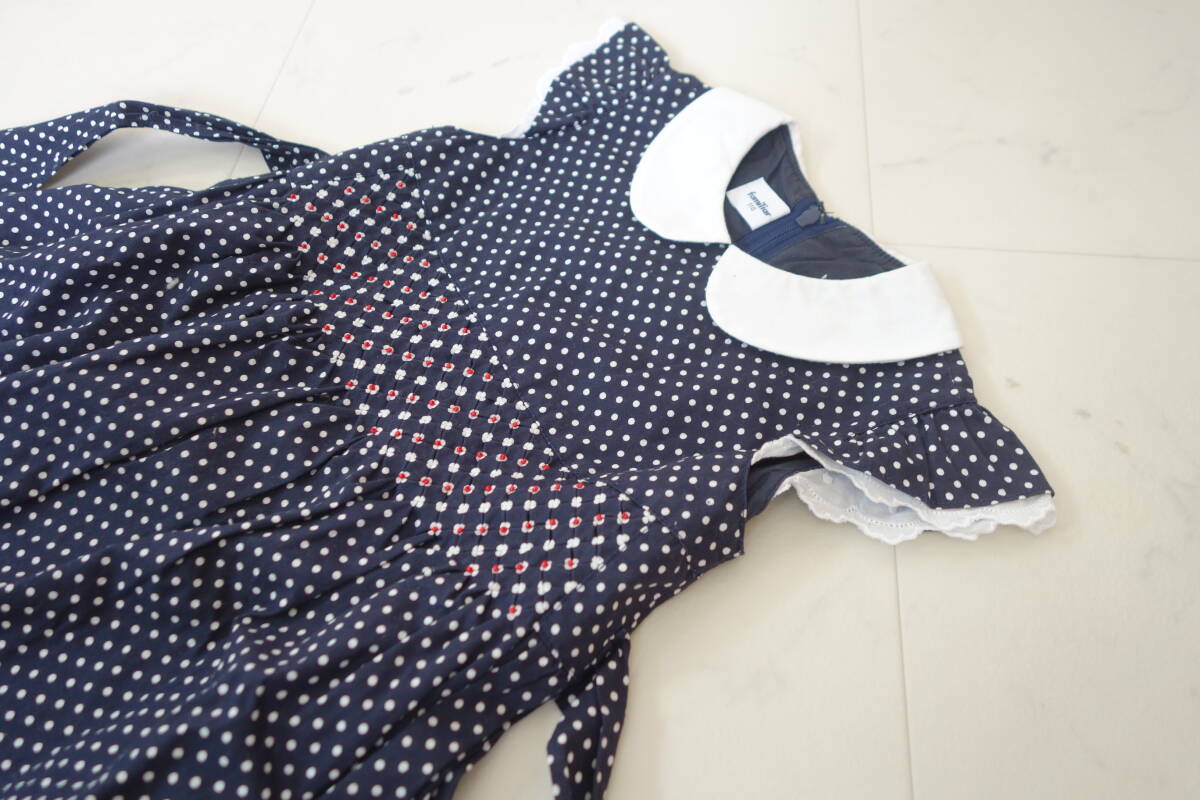 - 新品同様 2回着用 ファミリア ワンピース ドット柄×レース×ビーズ 日本製 レトロ 110 切り替えワンピース 送料185円(150)