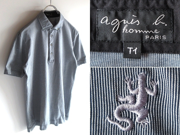 - ネコポス対応 agnes b. homme アニエスベーオム トカゲロゴ/レザール刺繍 BDポロシャツ T1 ネイビー ホワイト 紺 白 日本製 ボタンダウン