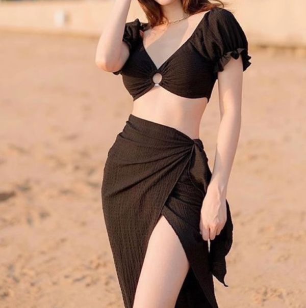 - レディース 水着 ビキニ パフスリーブ パレオ付 スリット EY81
