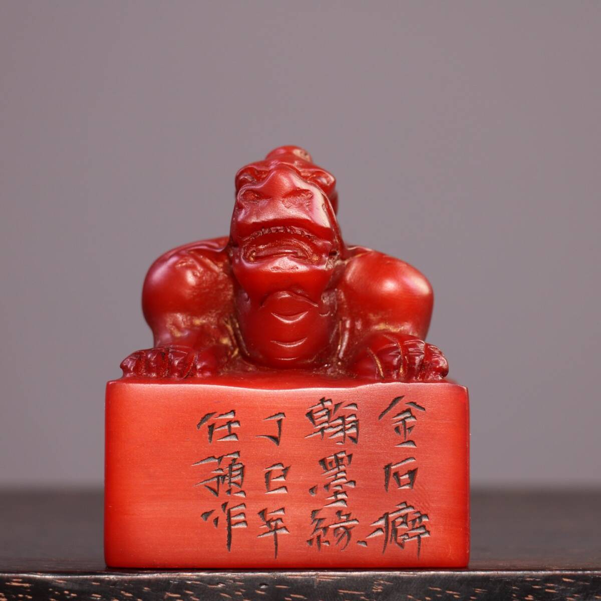 - 蔵友旧蔵出 寿山石 紅田黄石 細密彫 招財貔貅 印章 置物 賞物 中国時代美術品