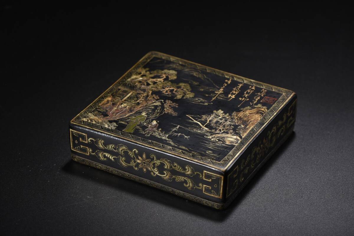 - 蔵友旧蔵出 木胎漆器彫 描真金 山水紋 詩詞賦 首飾盒 貴重物品 置物 賞物 中国時代美術品