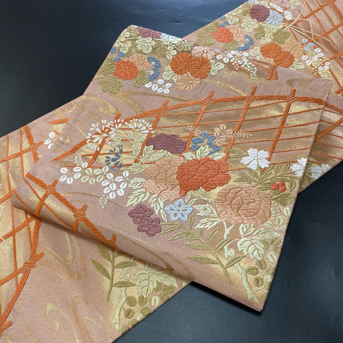 - #H007 美品 袋帯 六通 西陣織 綴織 金糸 牡丹 菊 正絹 薄柿色 和装 和服【wellriver】