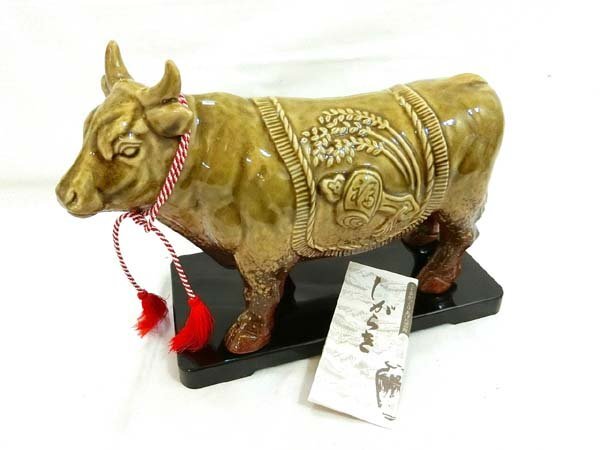 > しがらき 信楽 信楽焼 十二支 干支 丑 福 牛 陶器 置物 置き台付 専用箱なし 経年保管 ノーチェック中古 ■