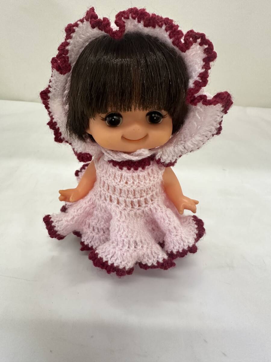 - 【丸-772】昭和レトロ/女の子人形/全長約15㎝/編み帽子/ワンピース/ピンク(AK)