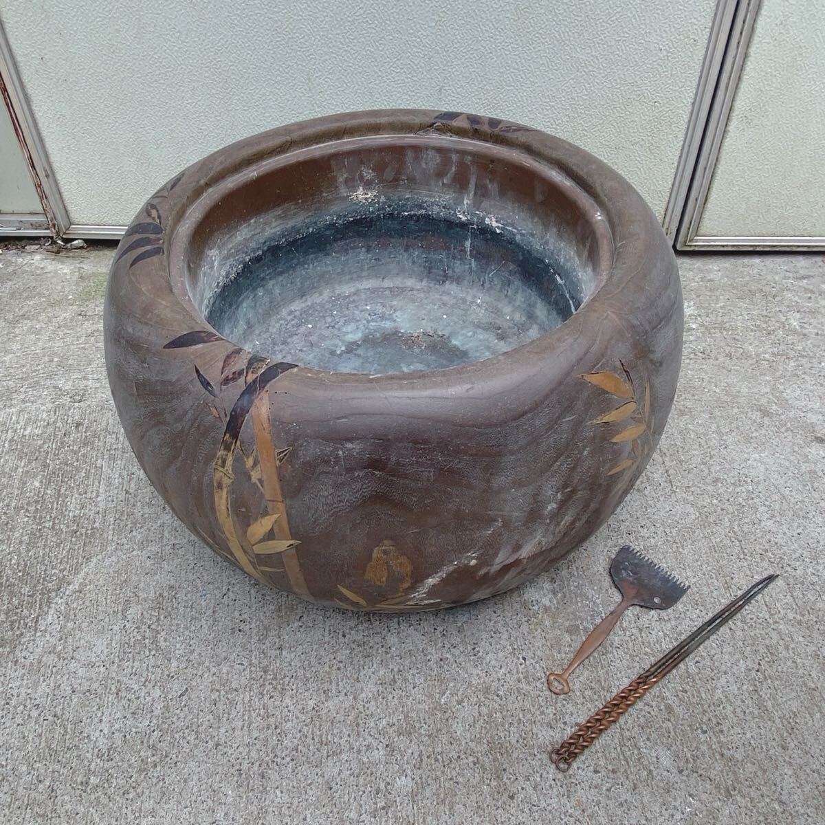 - refle● 火鉢 竹模様 火箸 灰ならし インテリア 木製 骨董 古民具 昭和レトロ 現状品