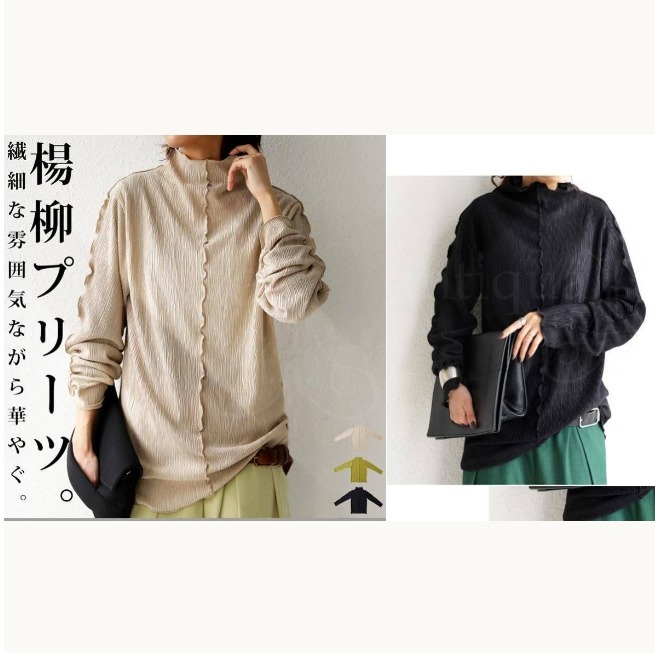 > 美品です 2枚セット アンティカ*楊柳プリーツ メロウトップス カットソー⑦ ブラック×2 ボトルネック ゆったりストレッチ