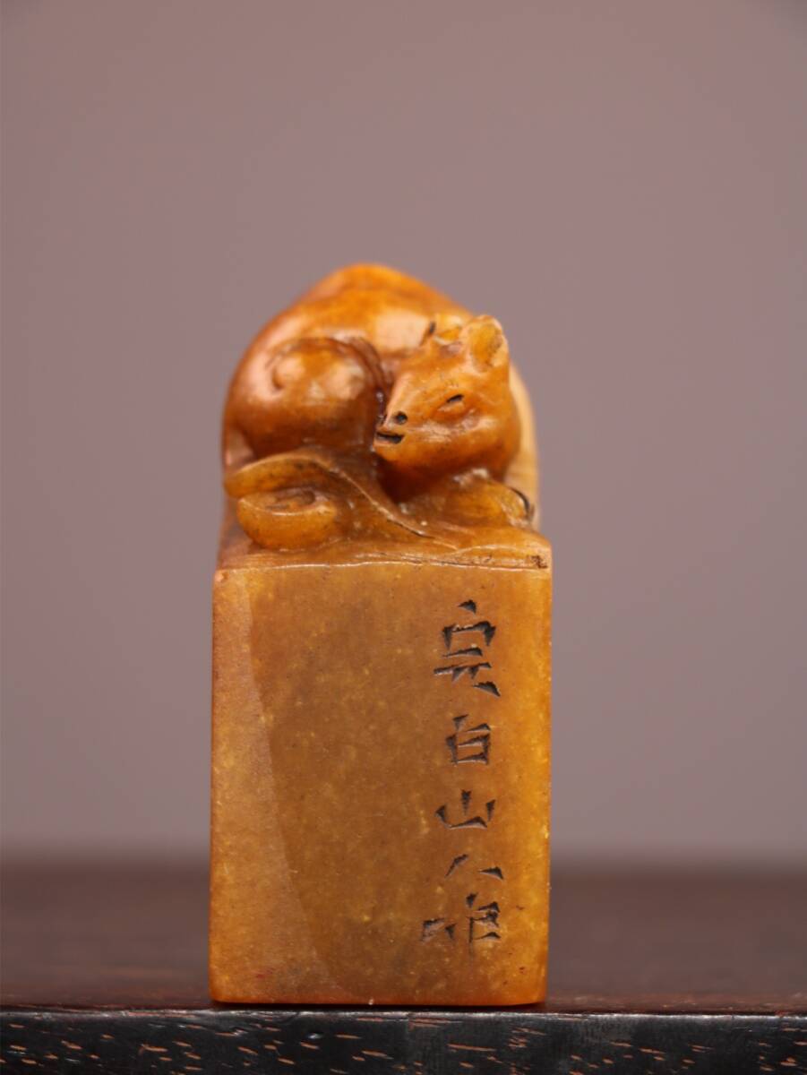 - 『館蔵珍品 寿山石 田黄石 細密彫 金鼠運財印章 印章 印鑒』文房具 書道品 貴重物品 収蔵品 中国古美術 時代物 古董品