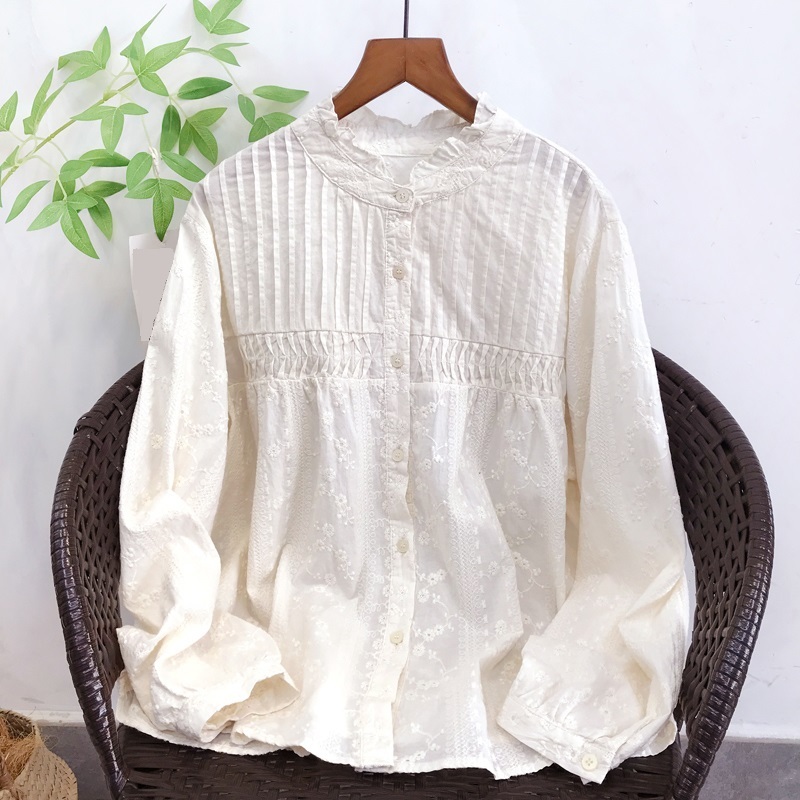 - 新品ヒダ 刺花柄 ゆったり フリーサイズ ワイシャツ チュニック トップス 綿100% 大人可愛 ナチュラル お色選択可