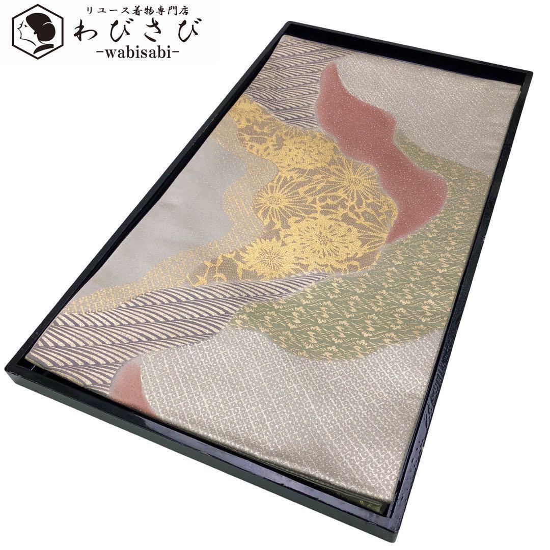 - 袋帯 一期一会 花柄模様 向鶴菱 金彩 絹鼠色 O-2366 着物 きもの kimono 和服 和装 中古 リサイクル着物 【送料無料】