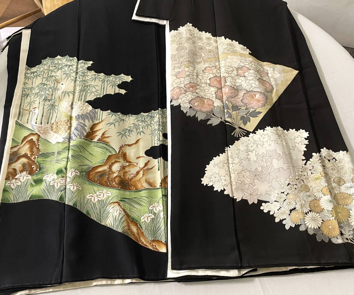 - 黒留袖/2点/花柄・鶴/リメイク・材料等に/正絹