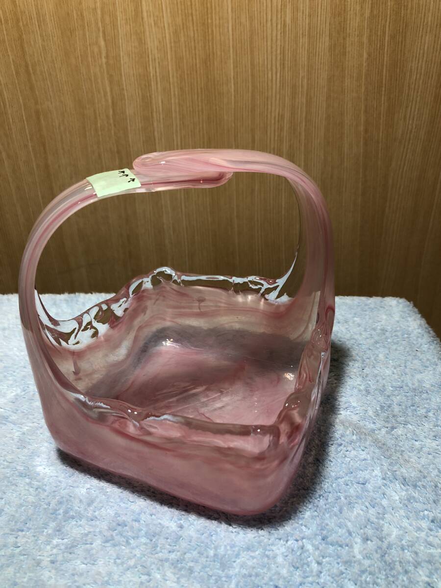 - 【送料無料】ジャンク品割れ有 岩田硝子 イワタガラス IWATA GLASS 手付鉢 花瓶 花器 ピンク 日本製 昭和レトロ ヴィンテージ 個人宅保管品