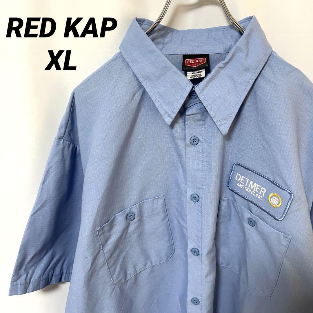 > N-4376 RED KAP レッドキャップ アメリカ古着 ワークシャツ 半袖 企業ロゴ 刺繍 ワッペン ロング丈 XL ブルー オーバーサイズ