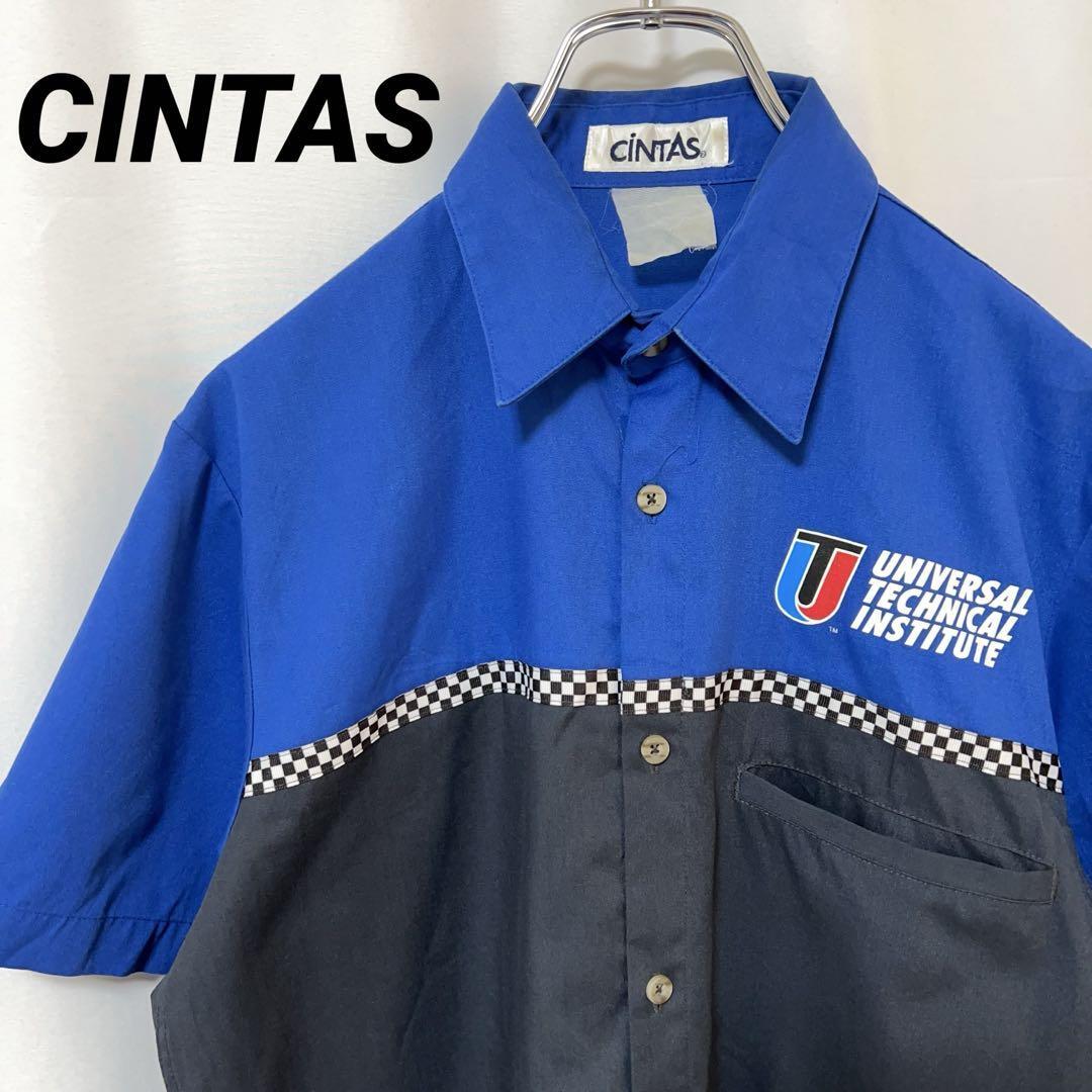 - N-4381 CINTAS シンタス アメリカ古着 ワークシャツ 半袖 企業ロゴ プリント M ブルー チェッカー柄