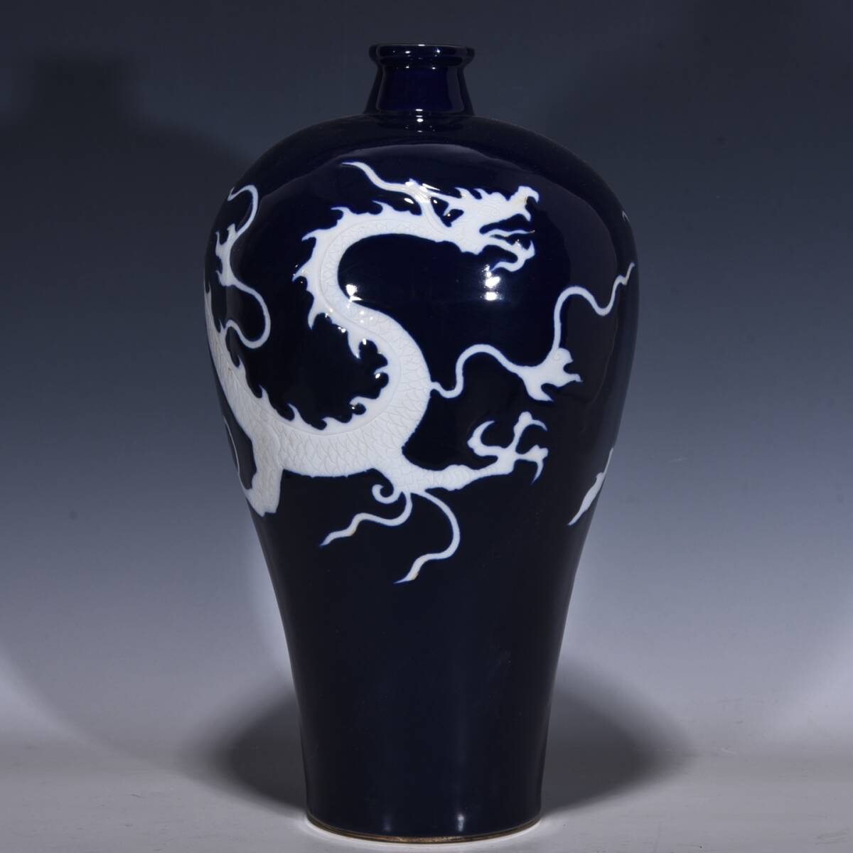 - 元時代 古陶磁器 藍留白 龍紋 梅瓶 花瓶 賞瓶 文案置物 置物擺件 時代物 古董品 骨董 旧家藏出 唐物 中国古玩 古美術品
