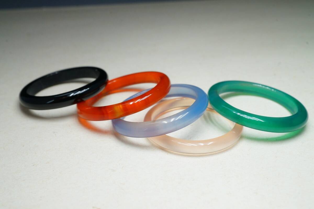 - 希少!原石を加工彫刻!極上アゲート瑪瑙メノウ、オニキス、ローズクォーツ彫刻研磨上質原石使用くり抜きリング【12号】5本セット