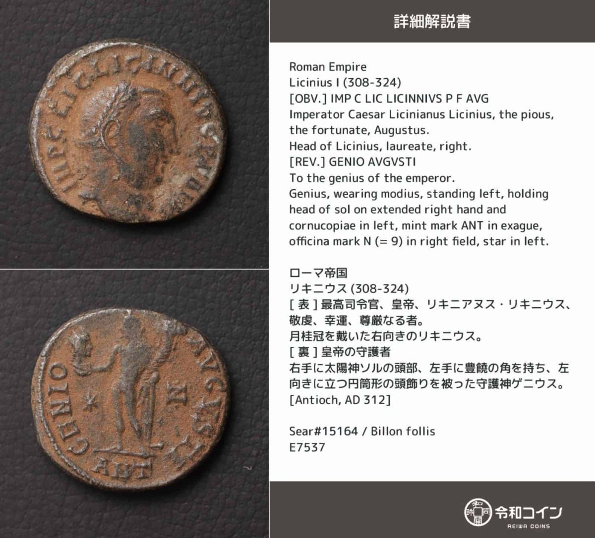 > *[令]リキニウス(308-324) 古代ローマコイン フォリス・ビロン貨【詳細解説書付】古代ギリシャ、銀貨[E7537]7j2