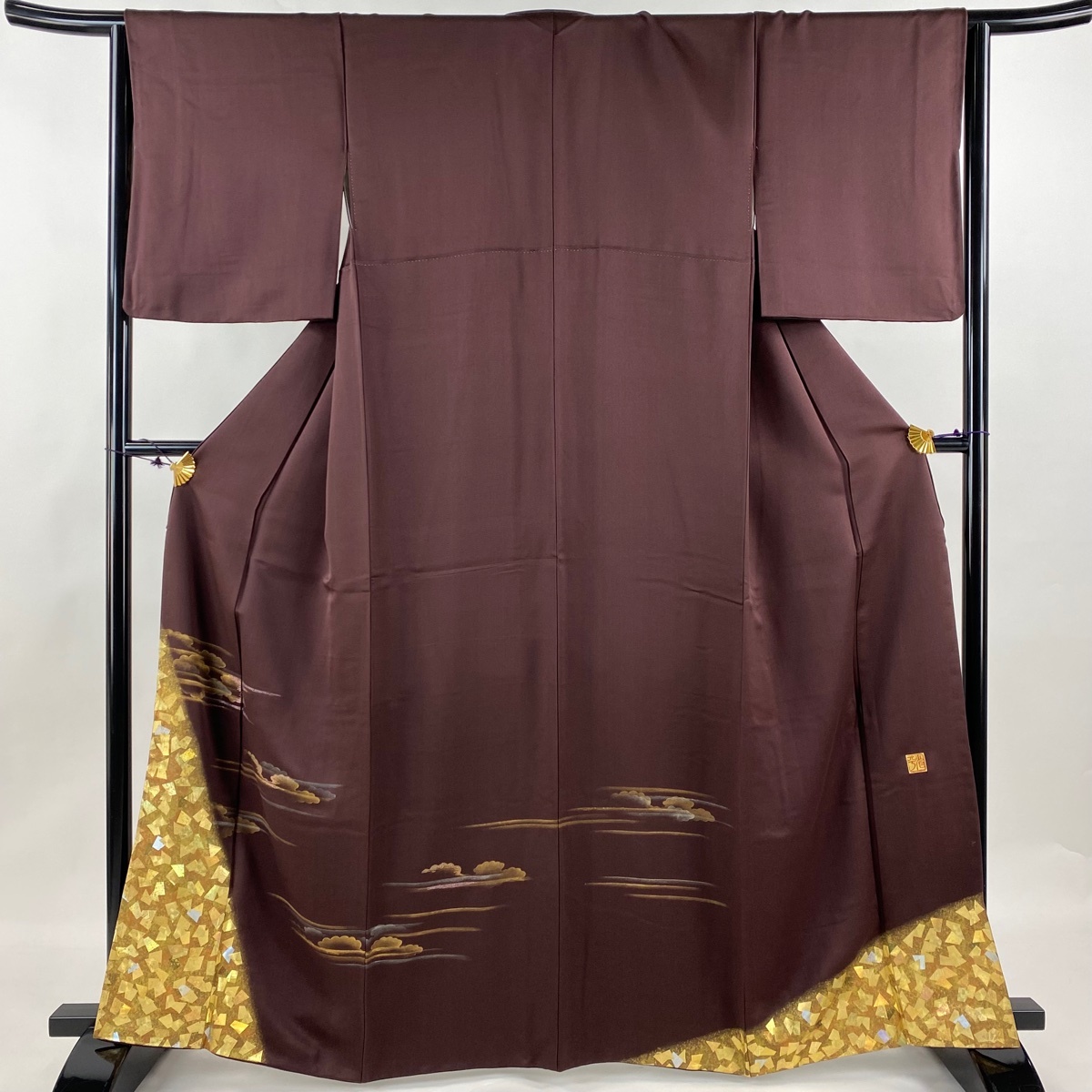 > 【在庫一掃】 訪問着 身丈162.5cm 裄丈63cm S 袷 堀省平 落款 箔散らし 雲文 金彩 茶紫 正絹 名品 【中古】