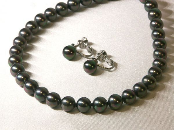 - まつよ 花珠貝パールネックレス イヤリングセット 42cm 黒真珠ピーコックカラー9ミリ42センチイヤリング koapkpn-09-1-42-ring