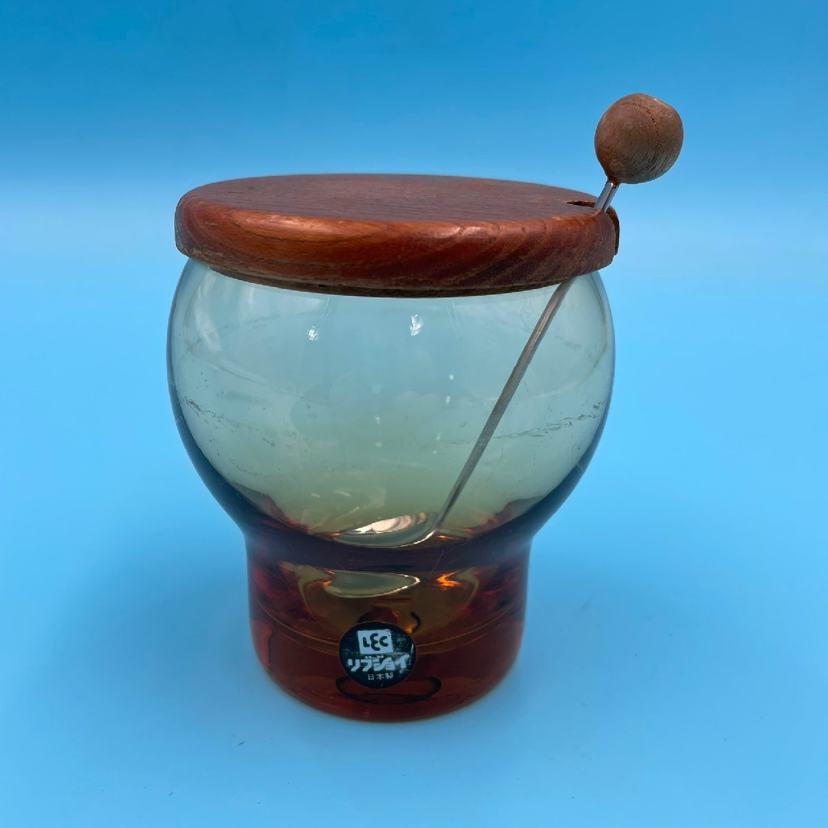 - 【17053Q038】 シュガーポット リブジョイ LEC ガラス 木製蓋 スプーン付き シール付き 小物入れ 飴色 アンバー 昭和レトロ 純喫茶 喫茶0