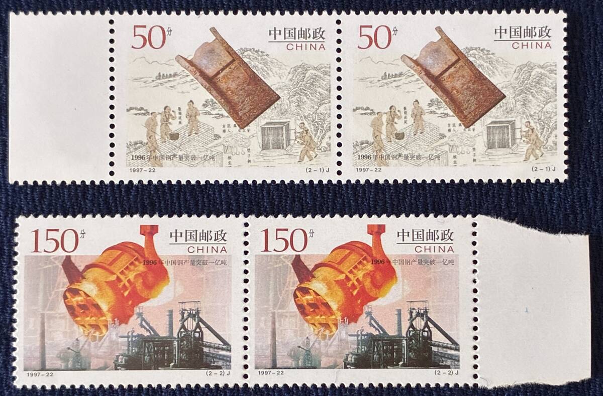 - 新中国切手ー未使用 1997-22J 1996年中国鋼鉄生産量1億トン突破 2種完ペア 耳付き