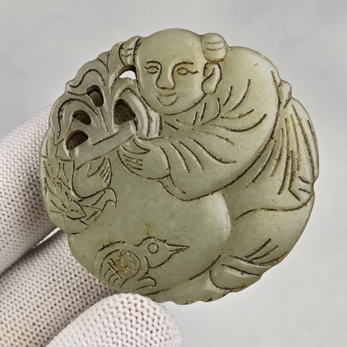 - 古美術 本物和田玉 青白玉 透彫 唐子紋 玉佩 根付 玉璧