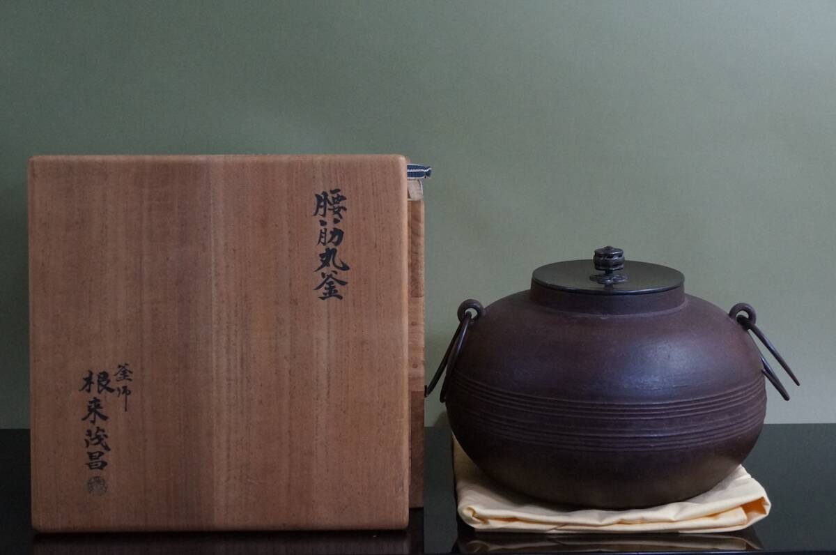 - ■ 腰筋丸釜「根来茂昌」(共箱)<釜鐶付き>★ 根来 茂昌 実三 鉄釜 茶釜 茶道具