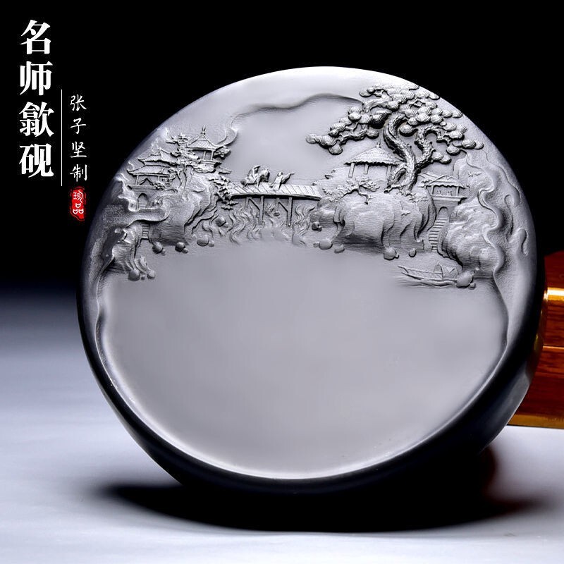 - 中国端硯 無形文化遺産 歙硯 逸品 收藏 《小橋流水》天然原石 老坑 竜尾山黒竜尾 手彫り 書道 絵画 文房四寶 木箱付き