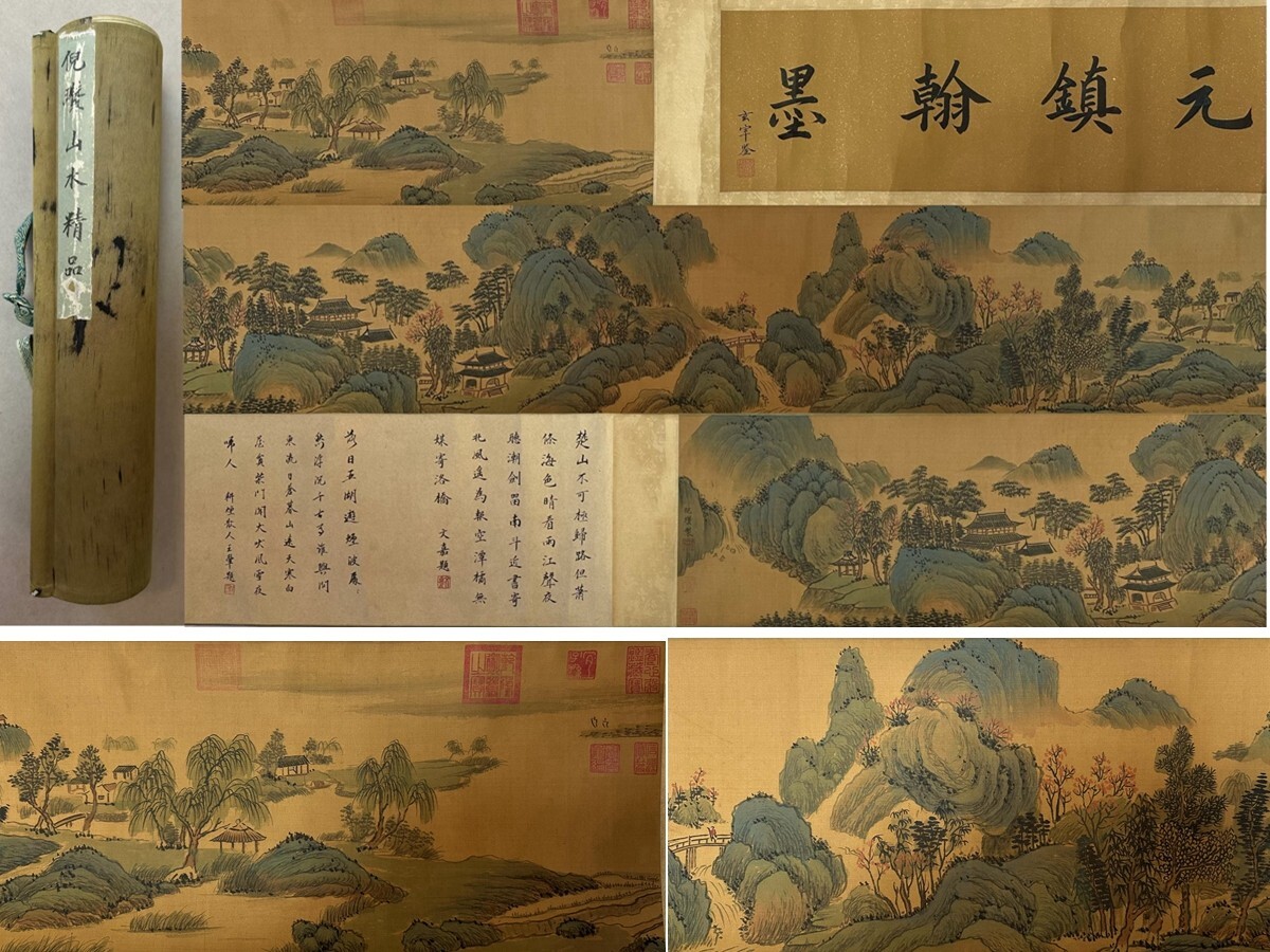 - 中国書画「元 倪サン 山水図手巻」肉筆絹本 掛け軸 墨寶妙品 書画横軸 巻き物 古美術 旧蔵出