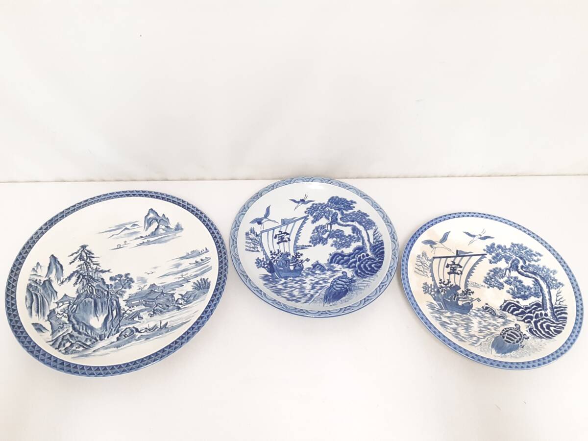 > 【初だし】染付 大皿 おまとめ3点セット/山水図/宝船/鶴亀松/飾り皿/絵皿/床の間飾り/盛皿/和食器/茶器/茶道具/インテリア/12-REB99