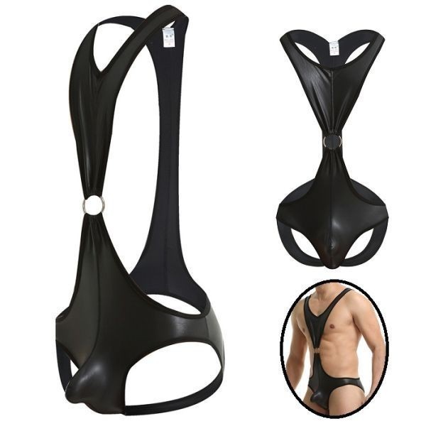 - レザー風 ボディースーツ フェイクレザー マンキニ コスプレ 仮装 SM 一体型インナ メンズセクシー服 M LT0002