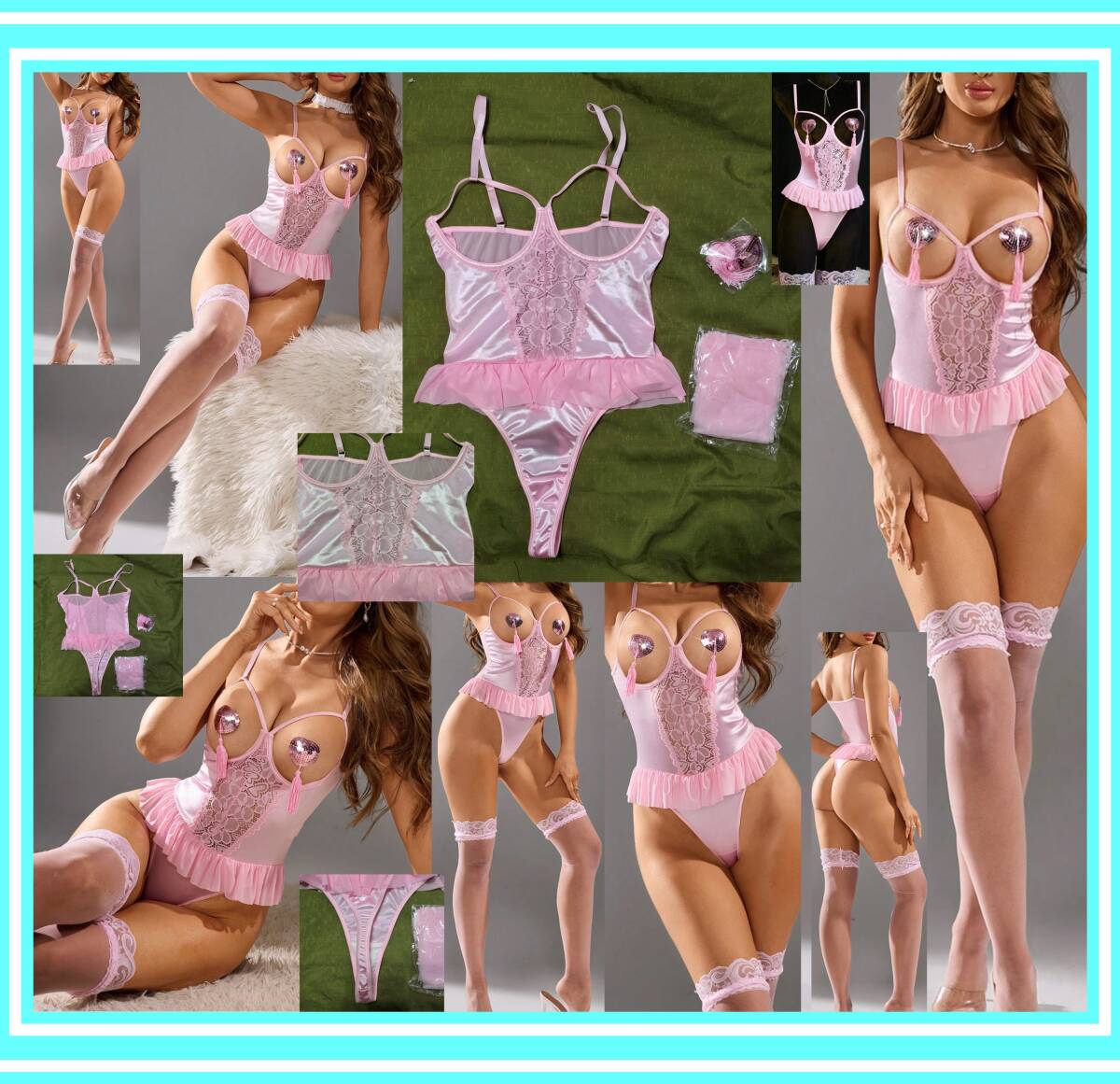 > ★超素敵★サテン★アンダーワイヤー★ピンク★テディ★ハイレグ&Tデザイン★カットアウト★チャーミング★ストッキング付★光沢★I51