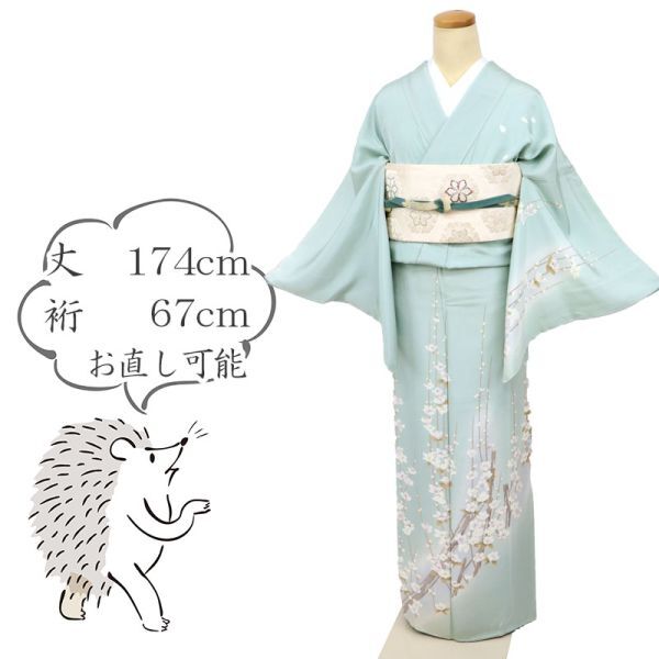 - 【訪問着】 長尺 しっとり花桃の花模様 淡いグリーン 袷正絹着物 SG4-5