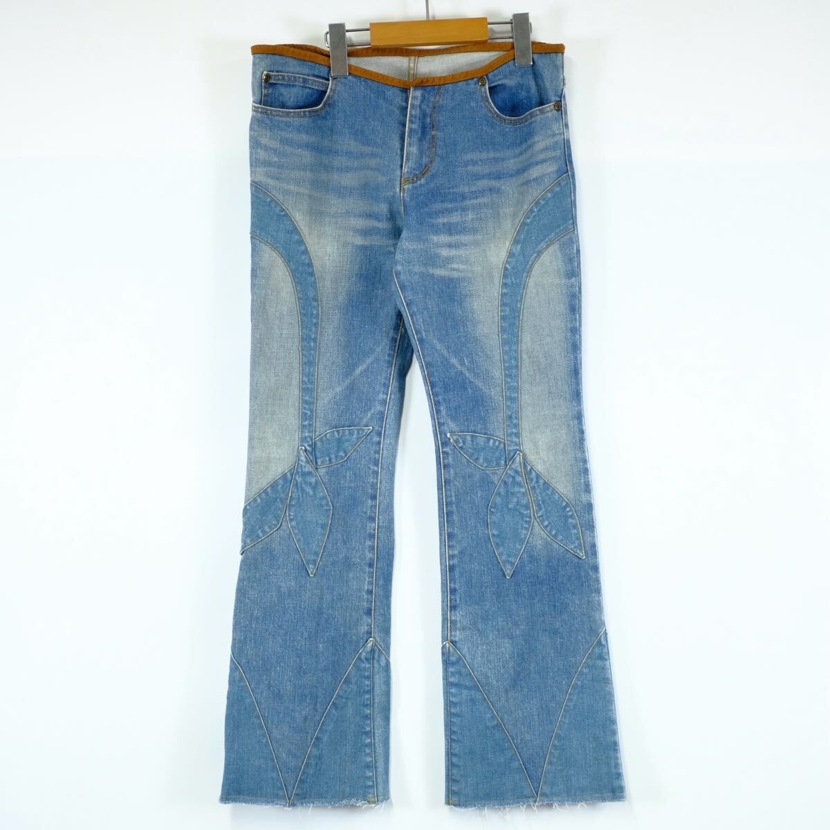 > ビンテージ パッチワーク フレアデニムパンツ Y2K レザー切り替え タイト 古着屋 デザイン アート 刺繍