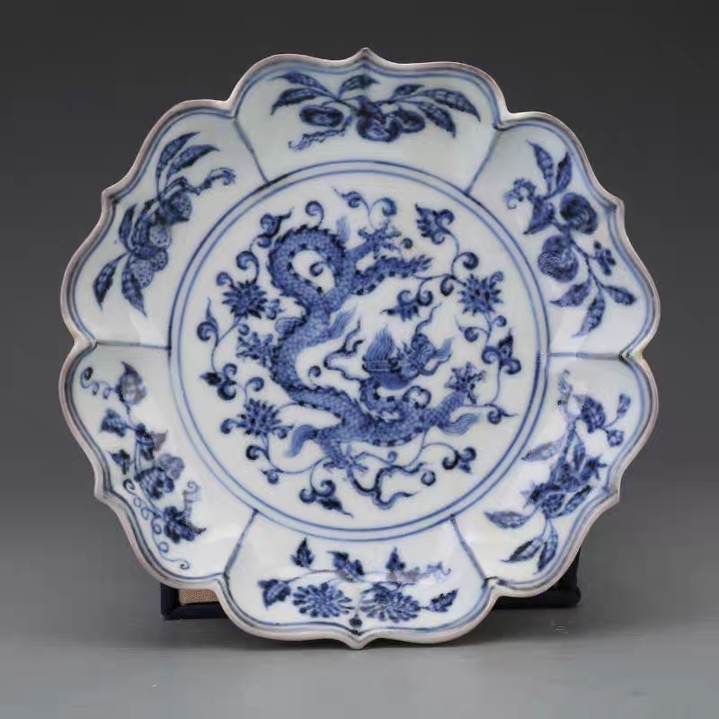 - 明時代 宣德年製款 古陶磁器 青花 龍紋 花口洗 水洗 盤子 皿 文案置物 擺件 時代物 古董品 骨董 旧家蔵出 唐物 中国古玩 古美術品